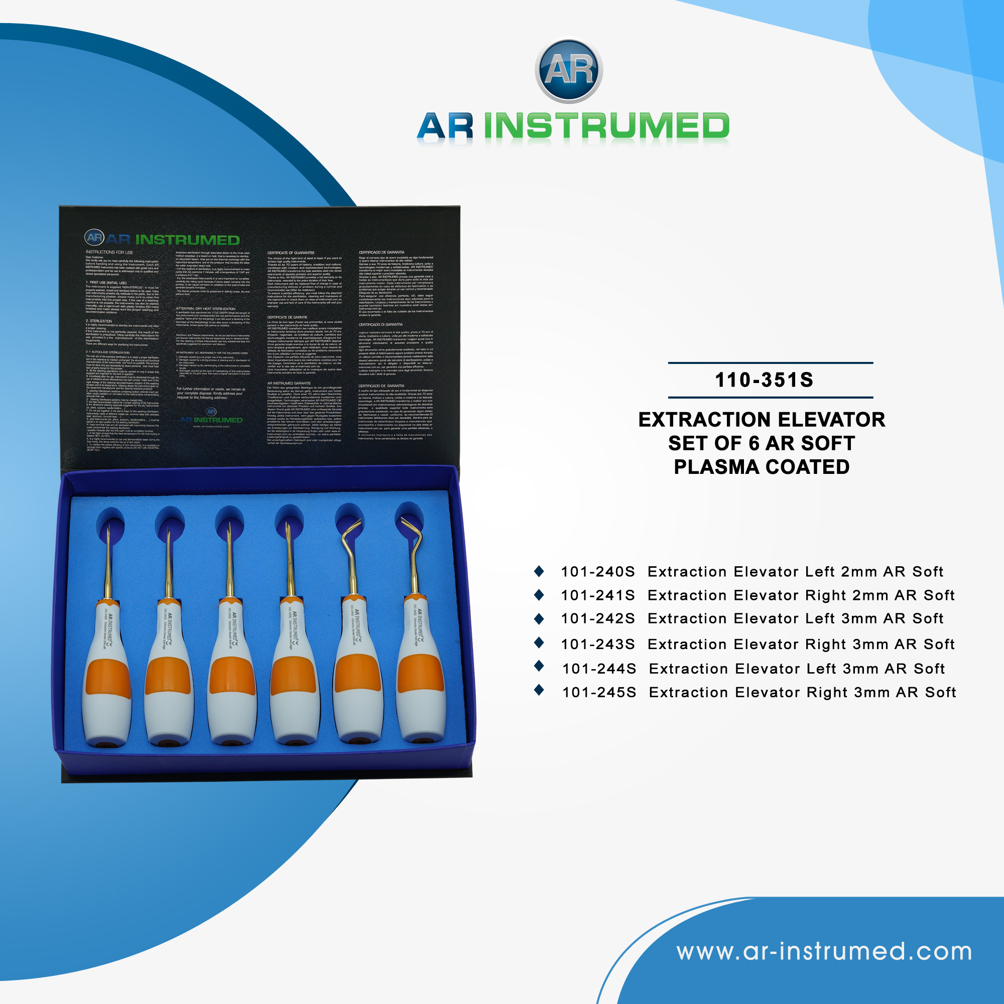 Extraction root elevator set of 6 pieces titanium coating